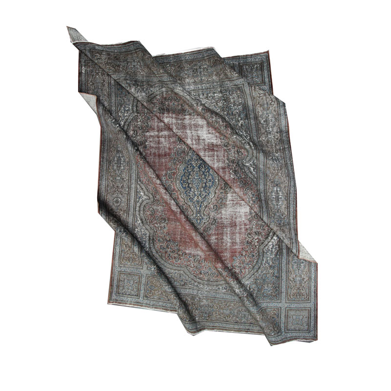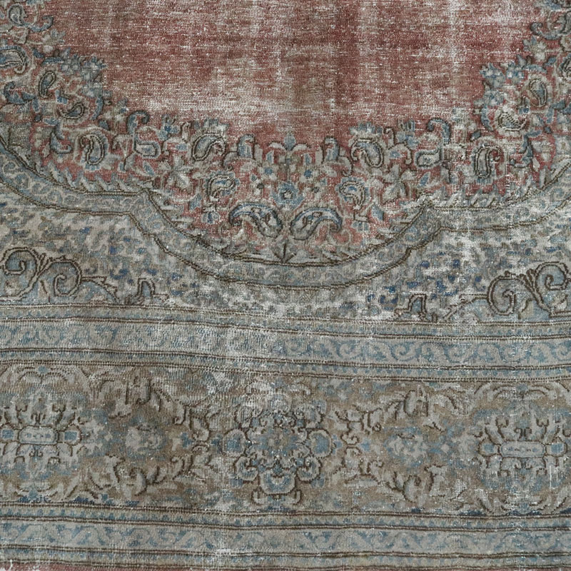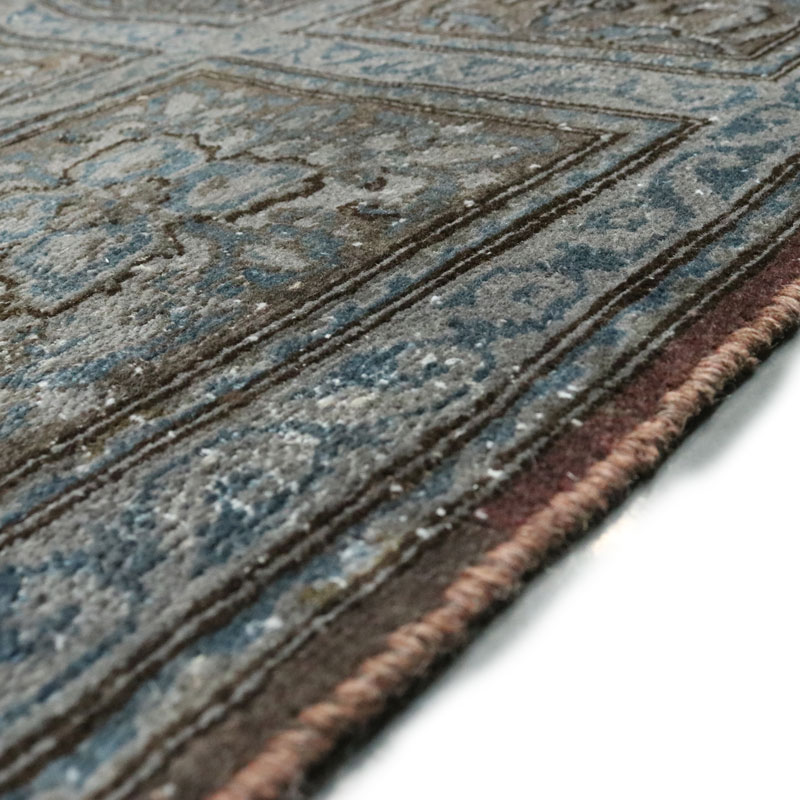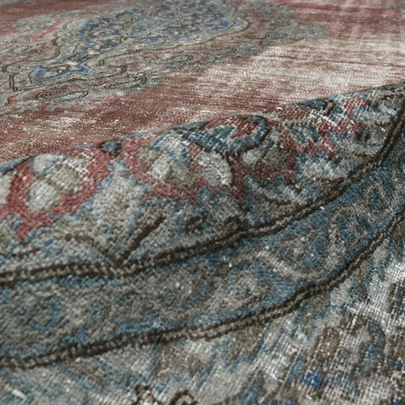ضخامت این قالی وینتیج دستبافت دودی قرمز (295×402) سانتیمتر 0.4 میلیمتر از جنس پشم و کتان خالص است.