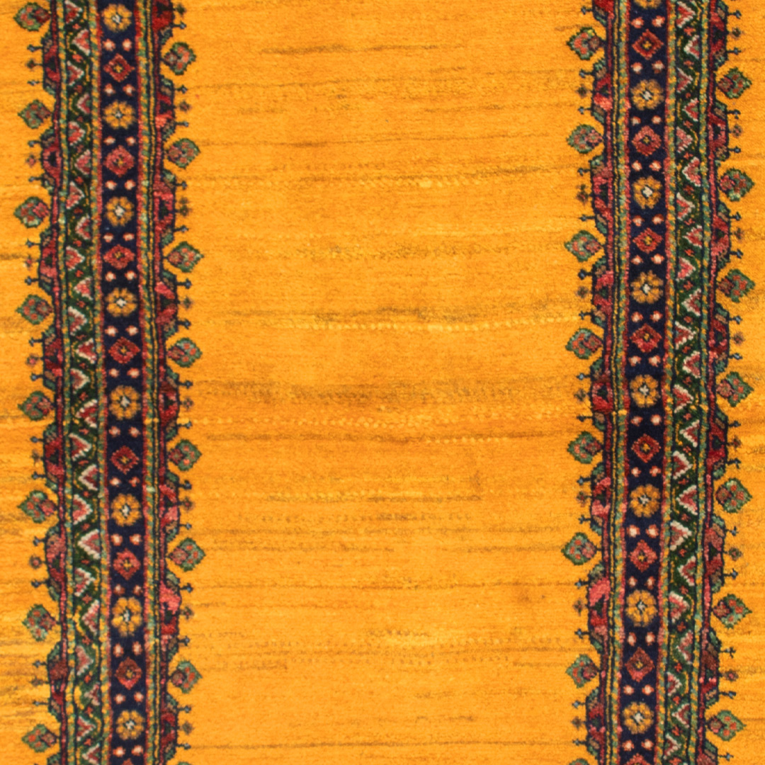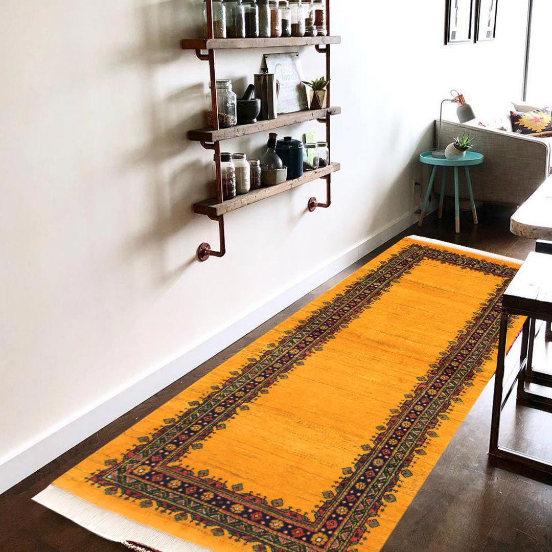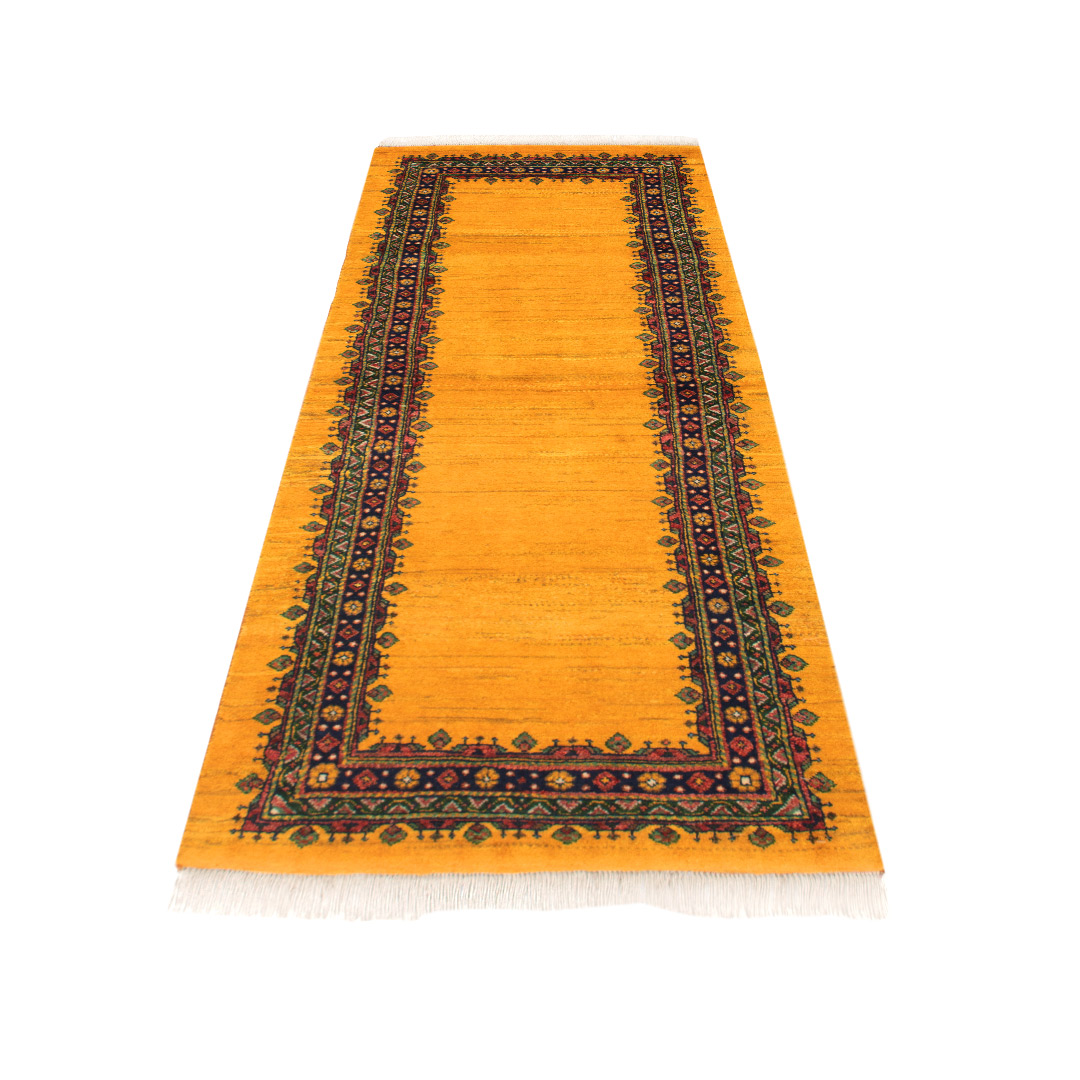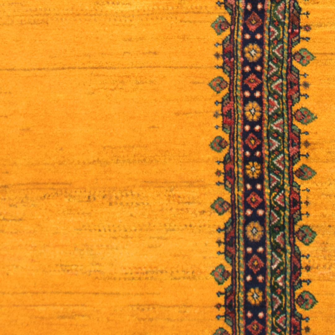 کناره دستبافت قشقایی(63×170)سانتیمتربا رنگ خیره کننده زرد که توجه نگاهها را به سمت خود جلب مینماید.