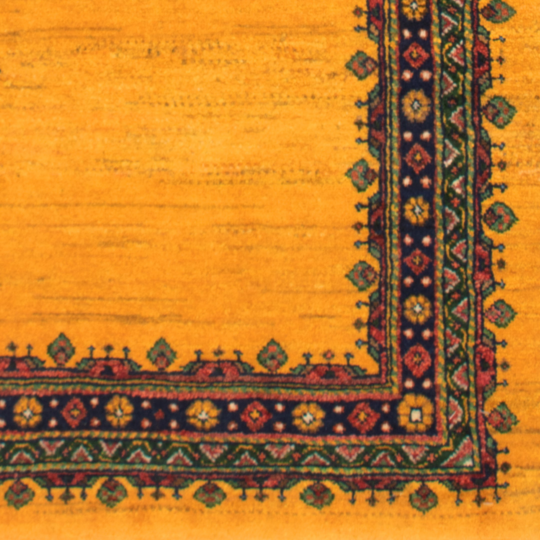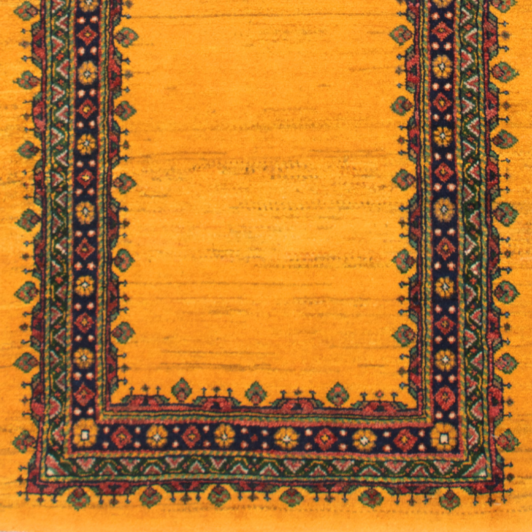 رنگ زرد آن و طرح ساده آن میتواند توجه بیننده را به خود جلب کند.حاشیه این فرش آدمی را به یاد هنر ظریف تذهیب می اندازد.