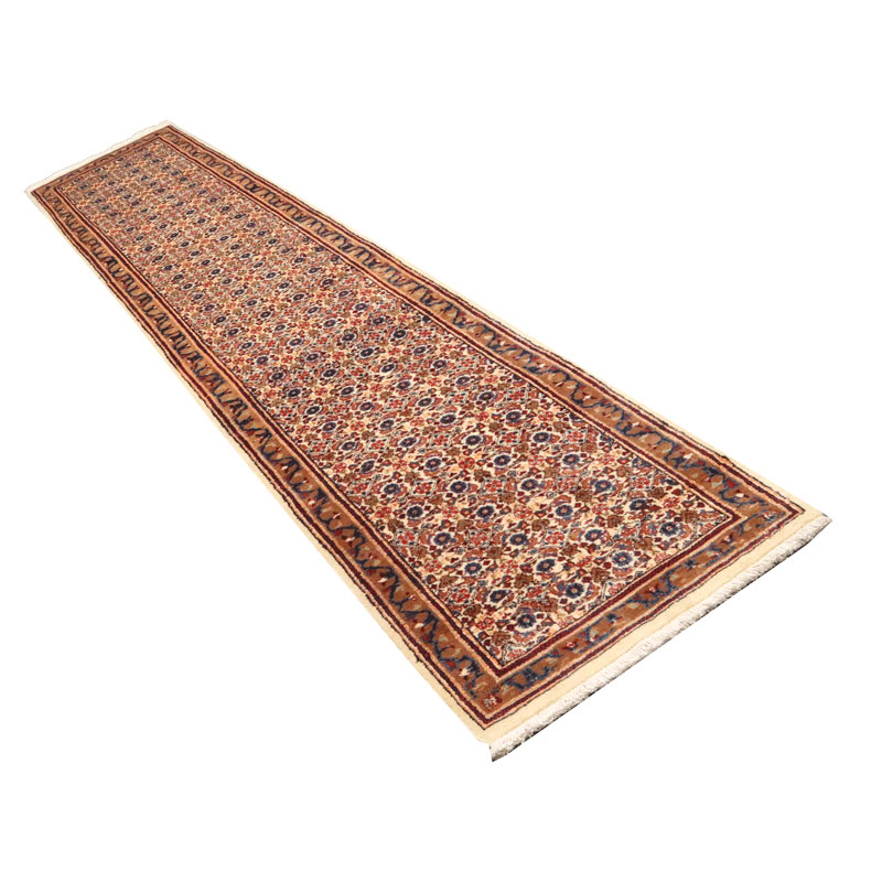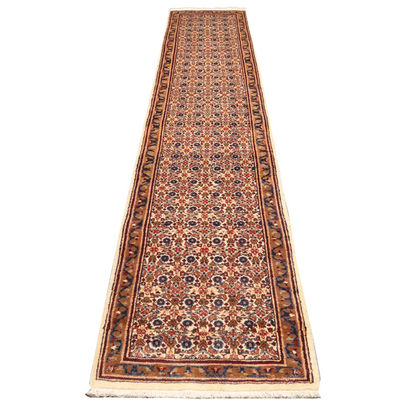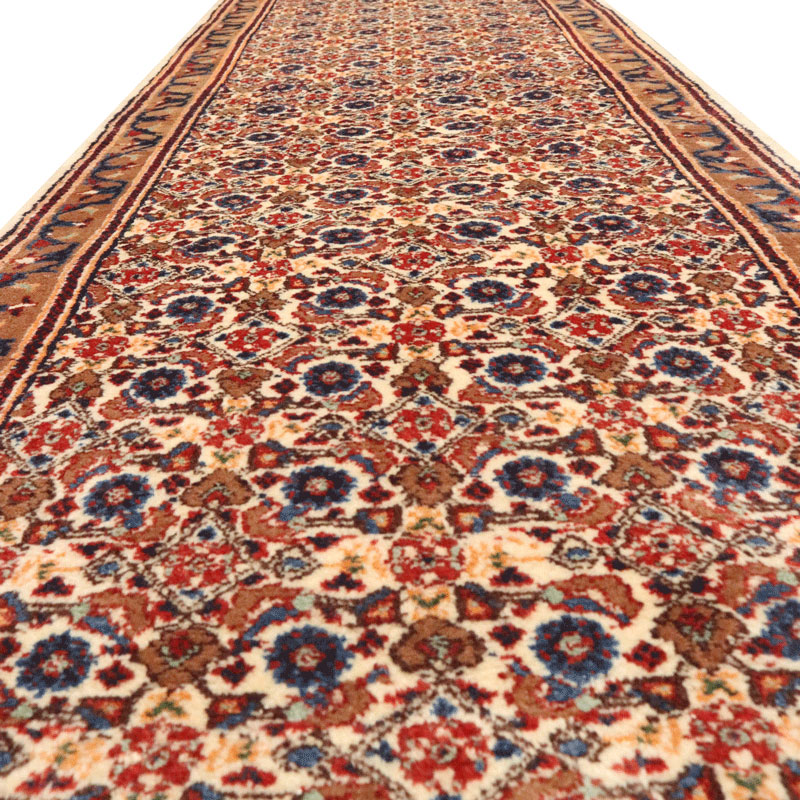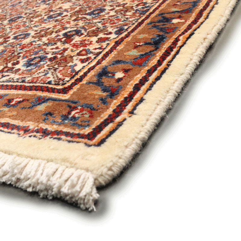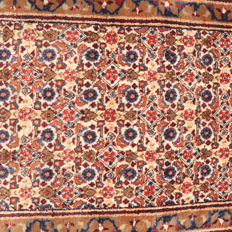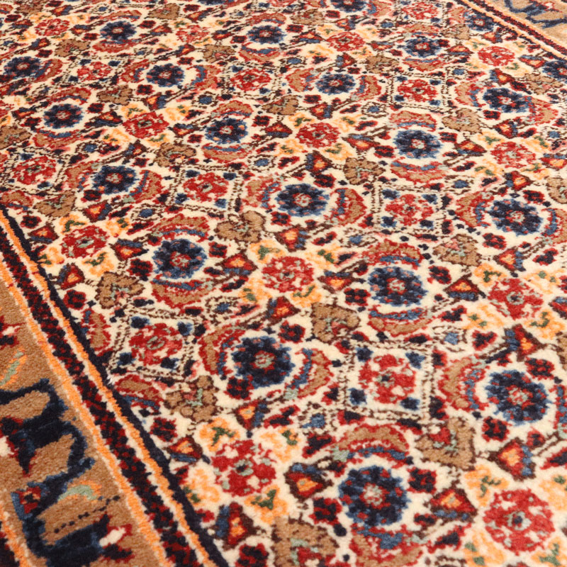 کناره دسبافت مود با مساحت 3.15 متر مربع و وزن 11 کیلوگرم با رنگ متن کرم و حاشیه شتری و ضخامت 3 میلیمتر.