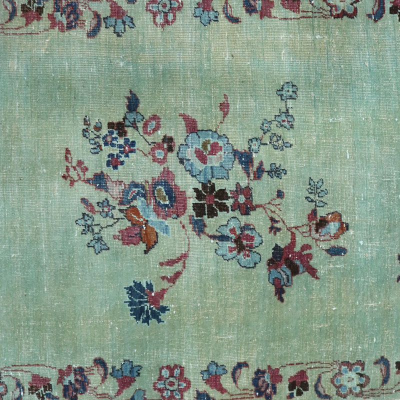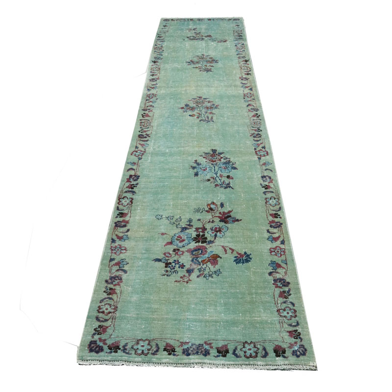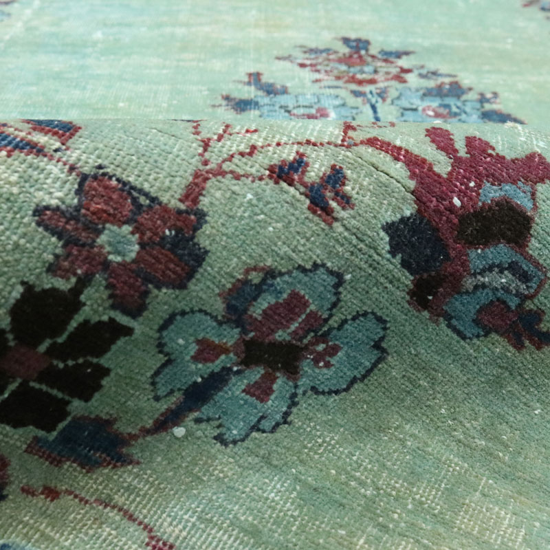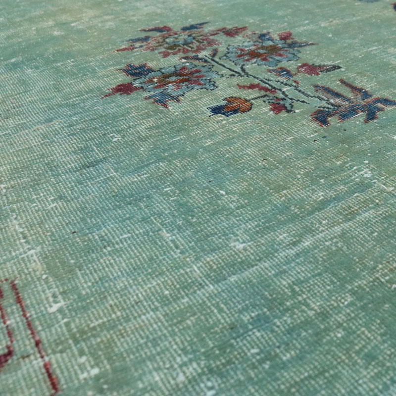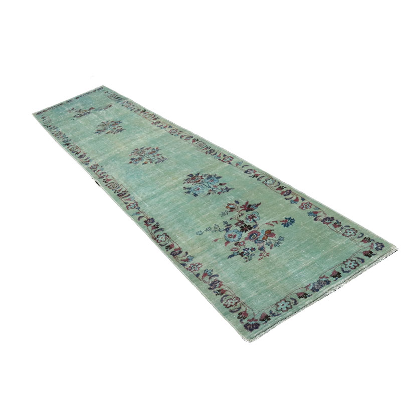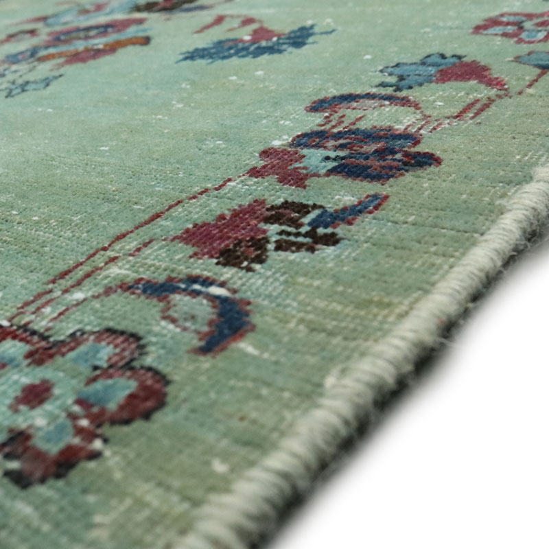 مساحت کناره دستبافت وینتیج فیروزه ای (81×372) سانتیمتر 3 متر مربع با نقشه کف ساده ل فرنگ از جنس پشم و کتان خالص است.