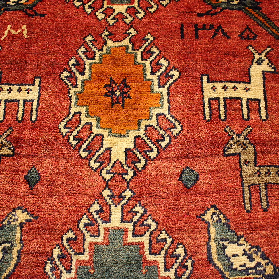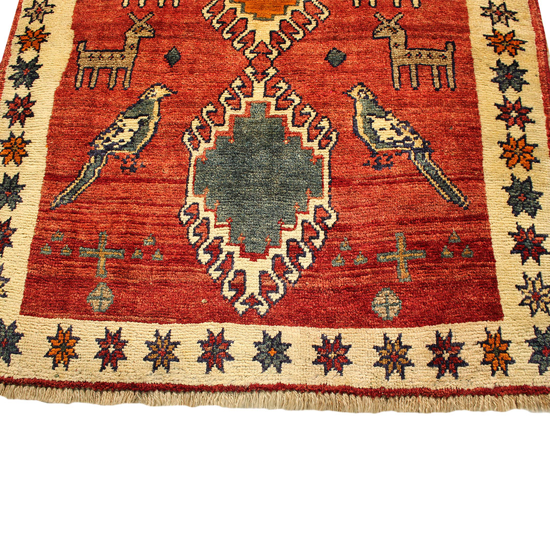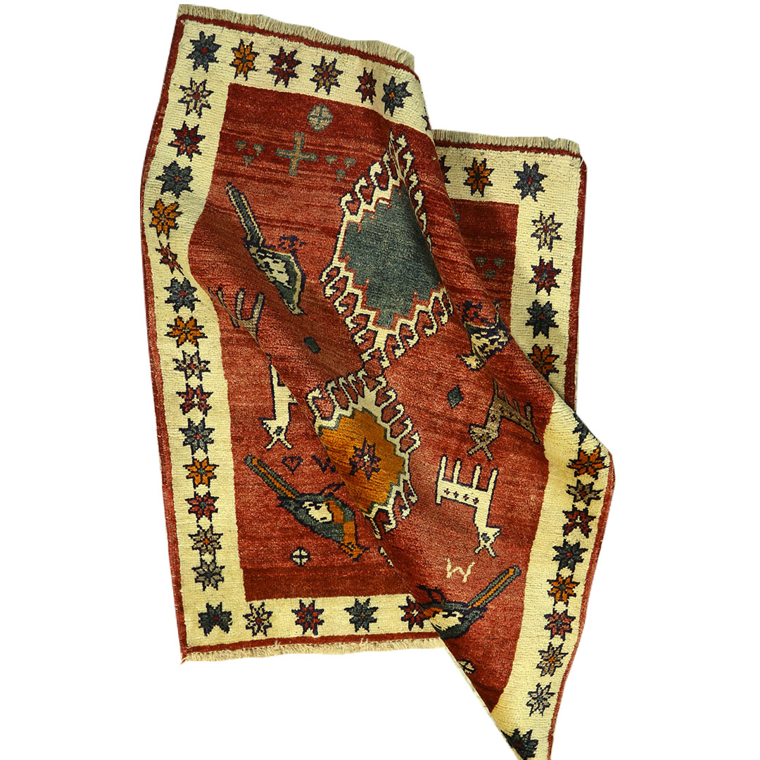 کدگبه:1118 -گبه دستبافت به شکل مستطیل ودر ابعاد: 125سانتیمترمربع و عرض:100 سانتیمترمربع بافته شده است،جنس چله گبه ازپشم و جنس پودها از پشم میباشد ،رنگ زمینه قرمزاست ،رنگها گیاهی و ثابت است در اثر شستشو دچار تغییر رنگ و پس دادن و پخش شدن رنگ در گبه نمیشود،مساحت که گبه در منزل شما اشغال میکند 1.25متر مربع میباشد،ضخامت و قطر آن در حدود ۱0میلی متر ودارای وزن 4.37کیلوگرم است،در بافت گبه از نقوش حیوانات استفاده شده و طرح خاص و بی نظیر میباشد .نحوه ی رنگرزی سنتی با استفاده از رنگهای گیاهی طبیعی و ارگانیک میباشد،و همین امرگبه را خوش رنگ و باکیفیت کرده است.
