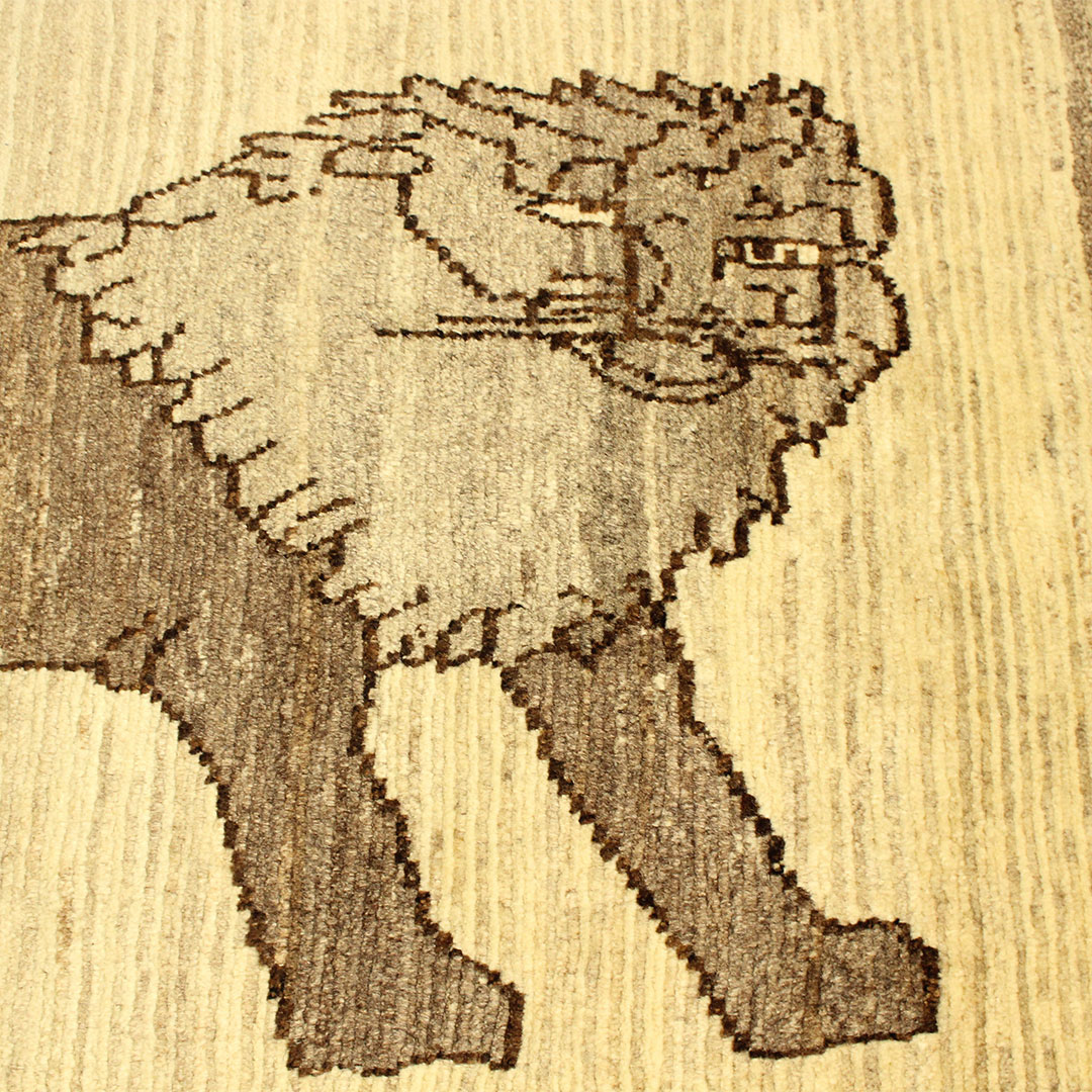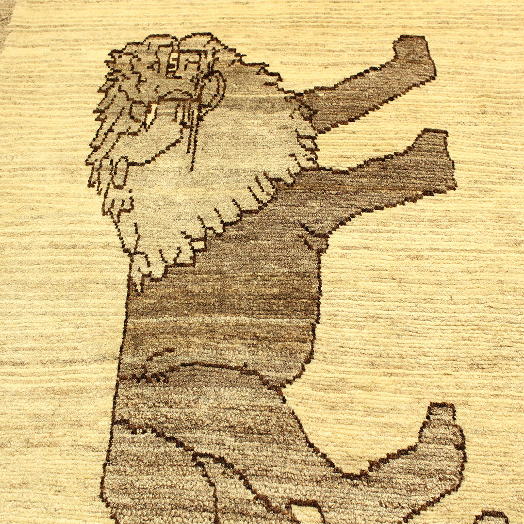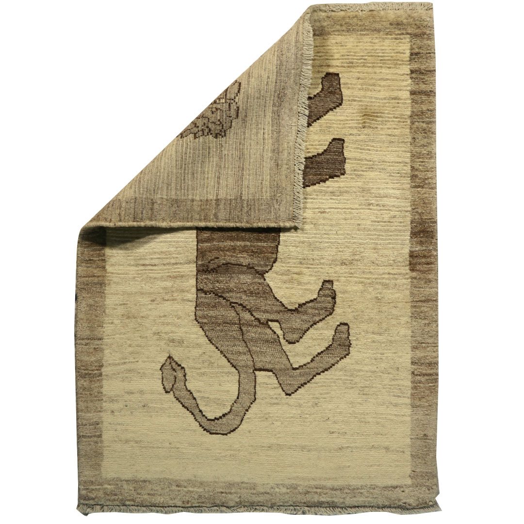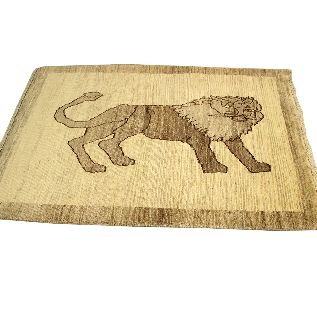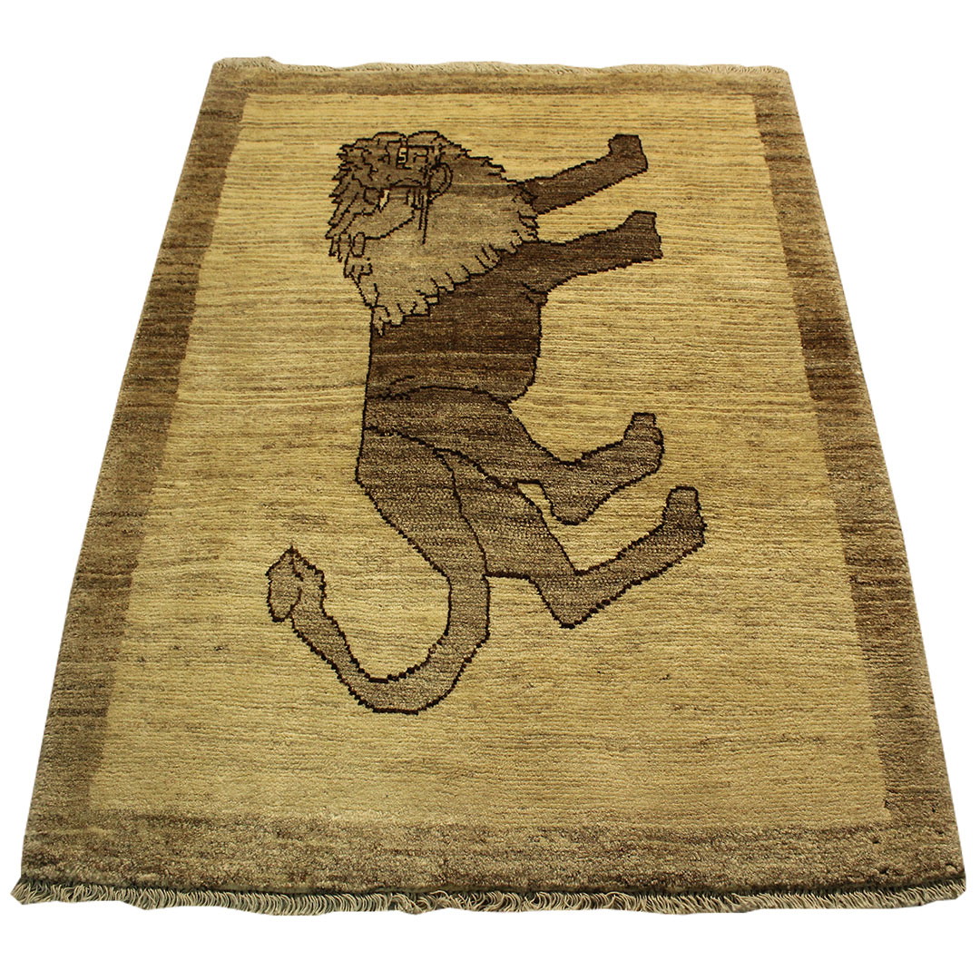 گبه دستبافت 1340- با نقشه شیر عکسی به شکل مستطیل ودر ابعاد 146 سانتیمترمربع و عرض 105 سانتیمترمربع بافته شده است.