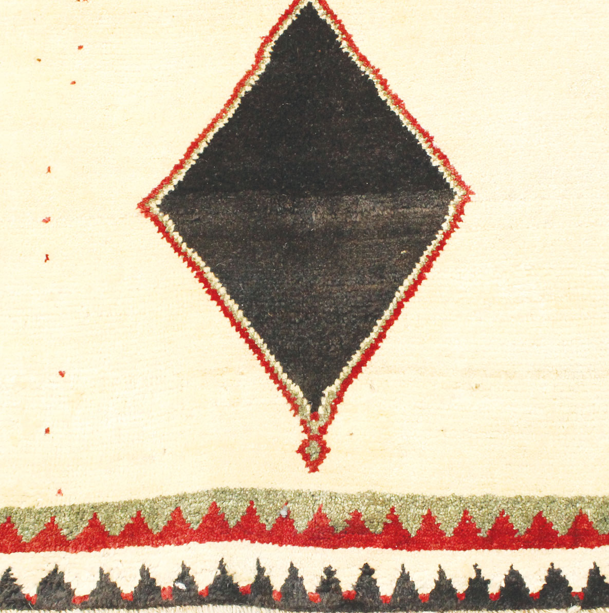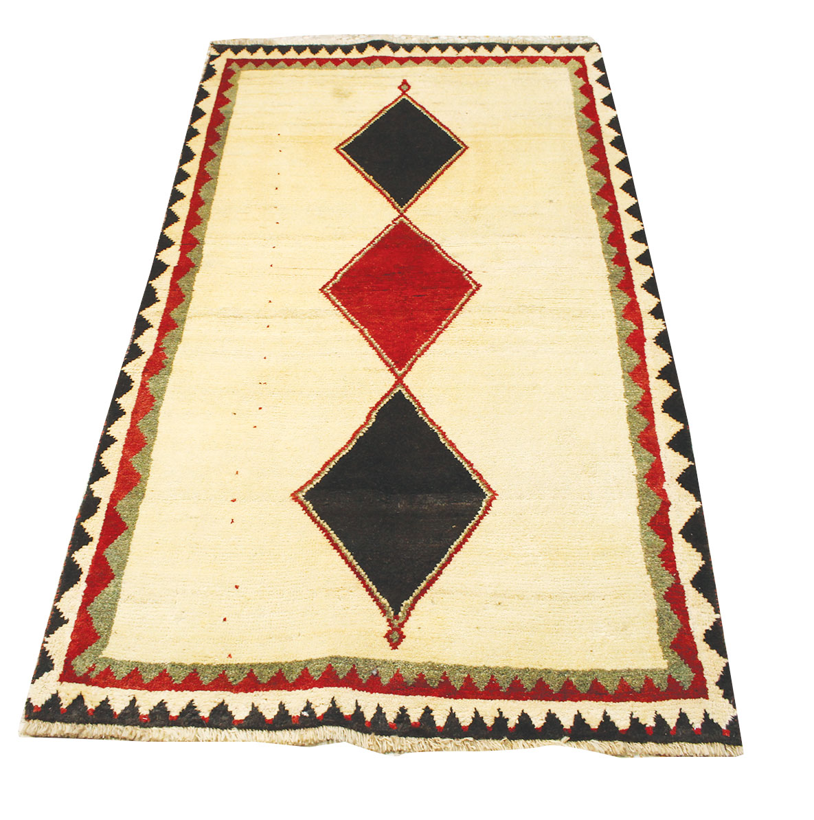 گبه دستبافت 1672- با نقشه هندسی به شکل مستطیل ودر ابعاد 190 سانتیمترمربع و عرض 75 سانتیمترمربع بافته شده است.